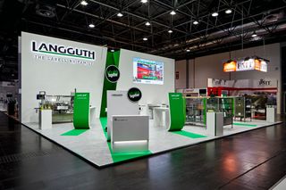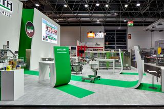 Moving images visible from afar arouse curiosity, attracting visitors to this booth. Labeling machines with different process technologies are exhibited on an open, accessible booth area.